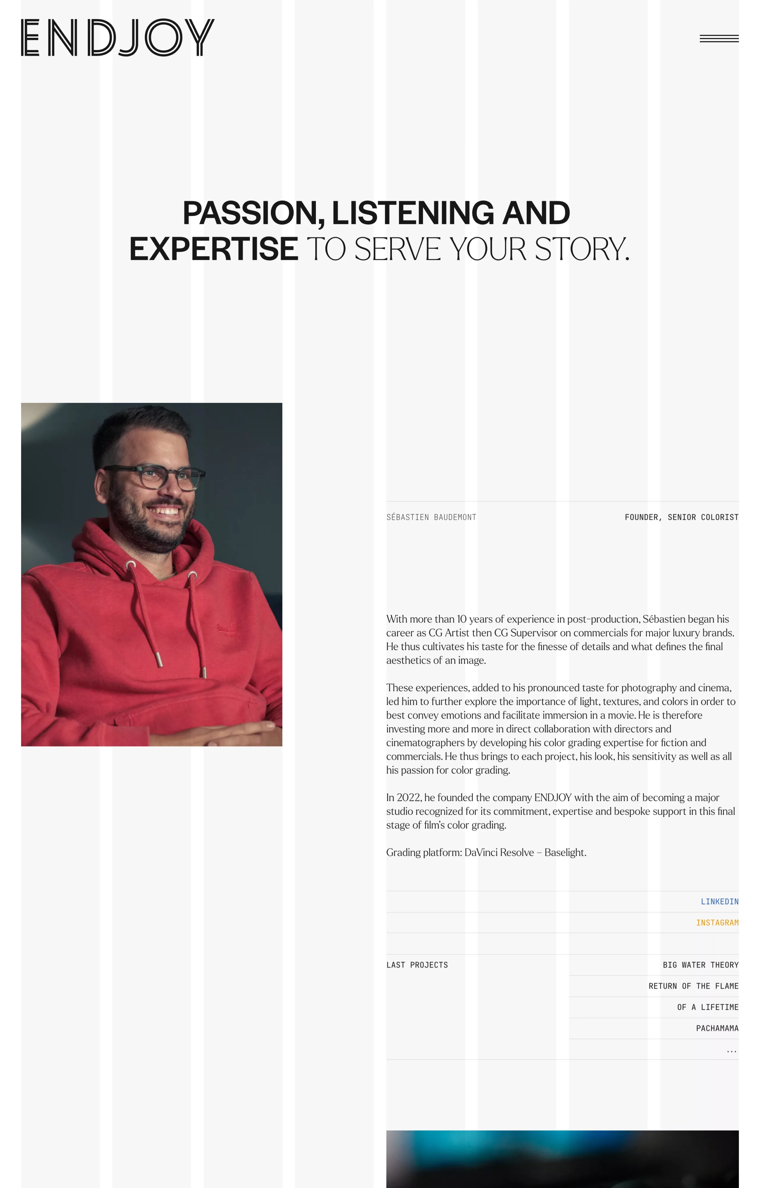 Grâce à une approche sensible et exigeante, Endjoy accompagne les réalisateurs dans la dernière étape créative, celle où la lumière, les contrastes et les nuances chromatiques donnent toute leur force au récit. Chaque plan est travaillé avec précision pour renforcer l’intention artistique, amplifier les atmosphères et faire vibrer les émotions à l’écran.