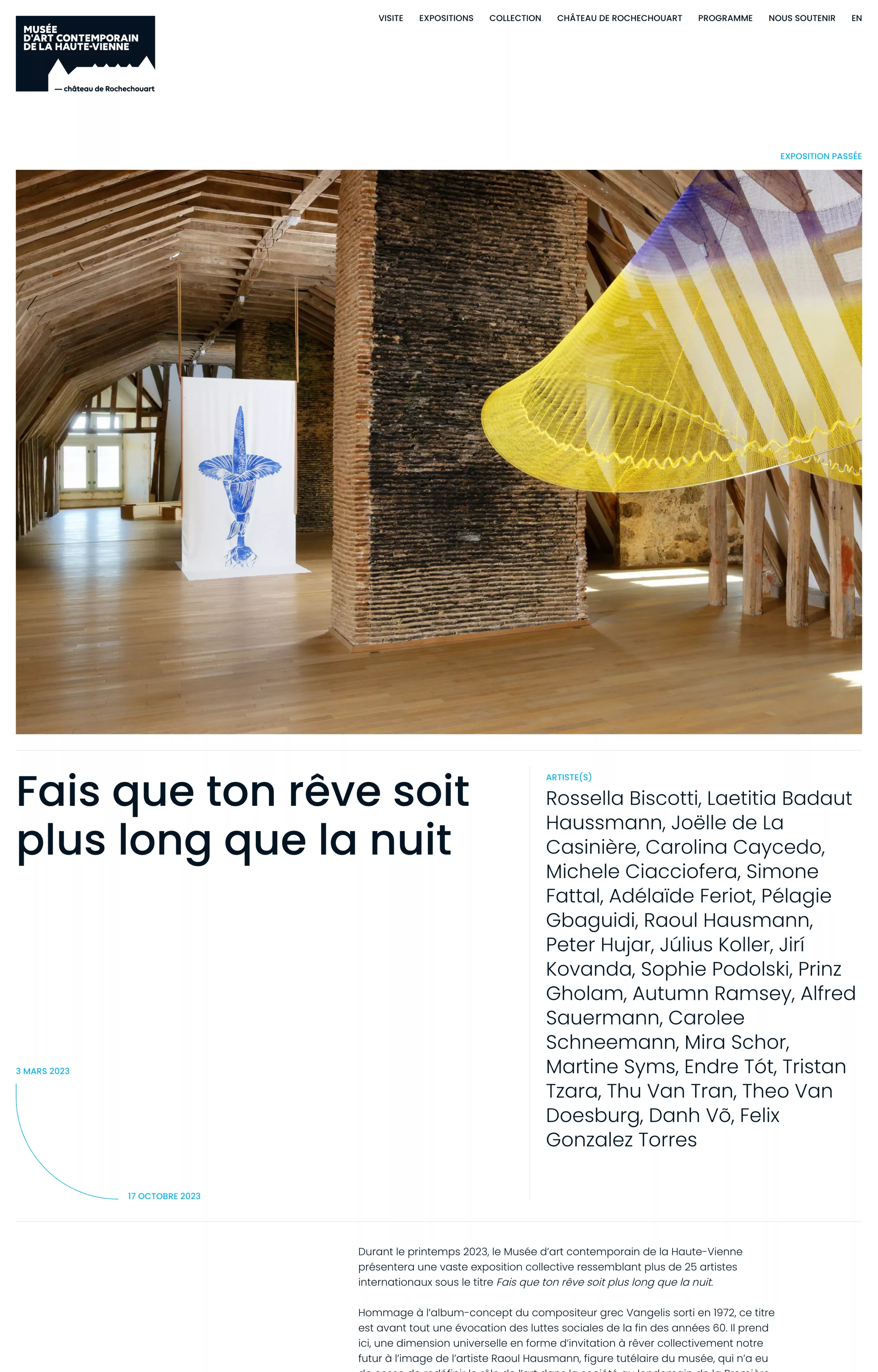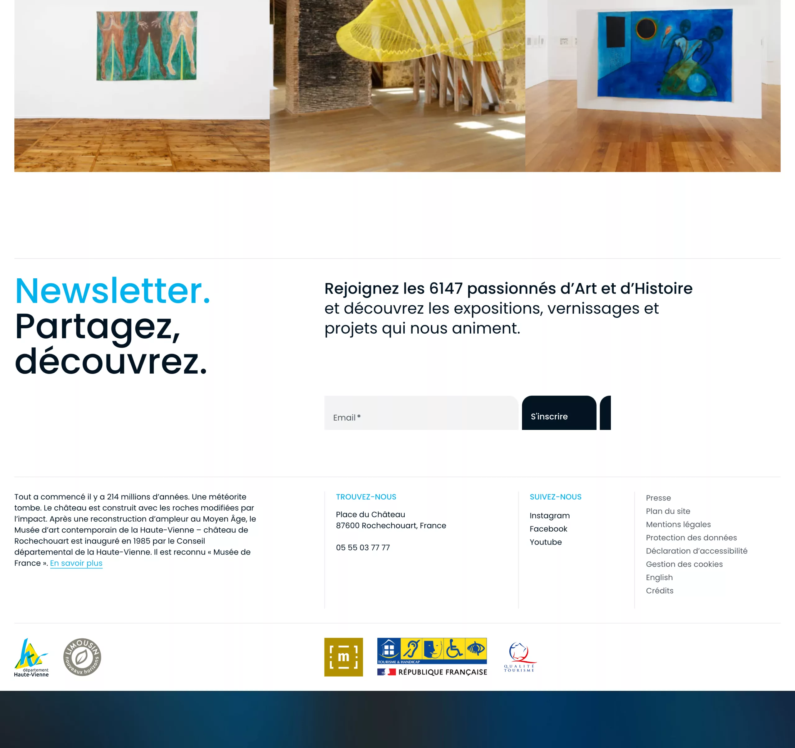 Situé dans le Château de Rochechouart, le Musée d’art contemporain de la Haute-Vienne instaure un dialogue permanent entre la création contemporaine et le patrimoine historique à travers son programme d’expositions et une importante collection d’art contemporain.